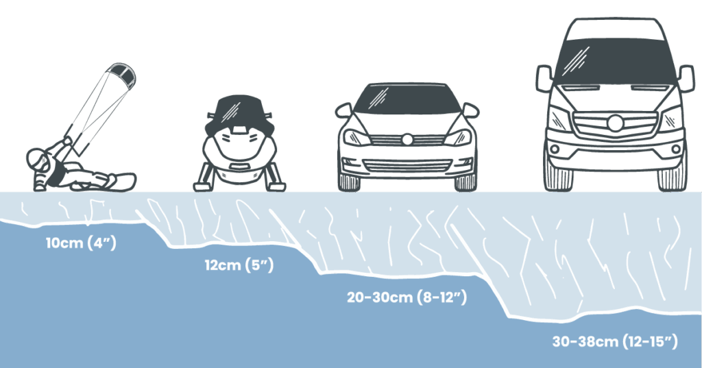 Sur les plans d’eau gelés, ne pas pratiquer à moins de 10 cm d’épaisseur de glace dite noire, celle qui est la plus dure. Toujours s’assurer de la sécurité et de l’épaisseur de la glace auprès des autorités locales.